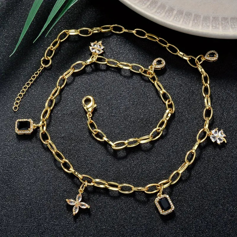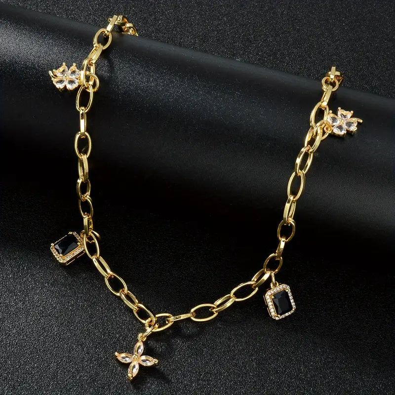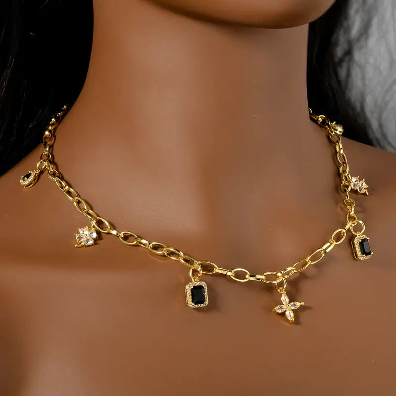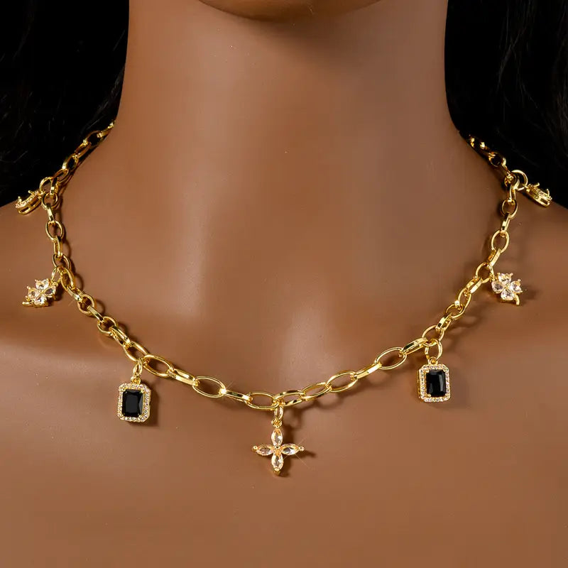 Bold, elegant, and effortlessly chic. The Noir Charm Chain Necklace is the perfect fusion of modern edge and timeless sophistication. Featuring a delicate gold-tone chain adorned with black gemstone pendants and crystal floral charms, this piece is designed for the fashion-forward woman who loves to make a statement. Whether worn alone or layered, this necklace is your go-to for luxury with a touch of mystery.